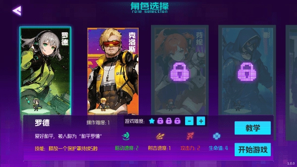 接下来,你可以挑选自己心仪的人物,同时也能够选择关卡的难度。要是你不太清楚怎么玩,还能进入教学模式。