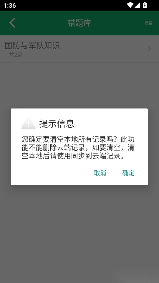 4.然后在“错题库”功能菜单界面找到右上角“清空”按键点击后出现“提示信息”点击“确定”按键就可以清空记录了