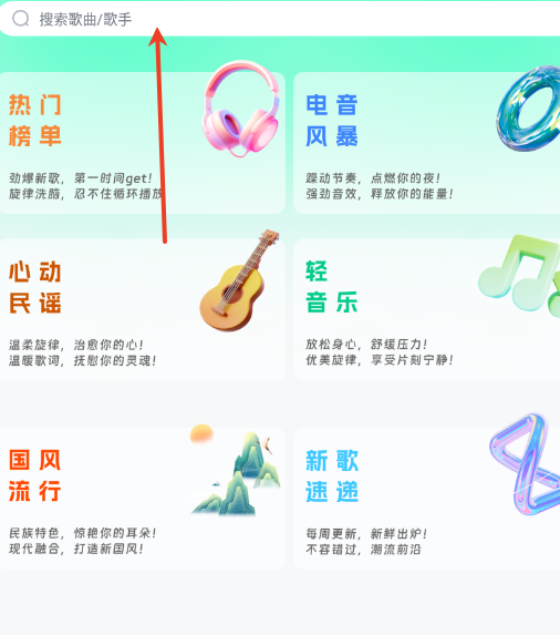 1、用户需要进入首页,在搜索栏输入你想要音乐关键字。