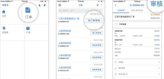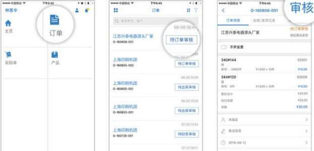 客户所下订单,企业可在【订单】中进行查阅。进入订单列表后选择待审核订单进入订单详情页面,通过点击右上方的蓝色【审核】来对订单进行订单和财务审核。