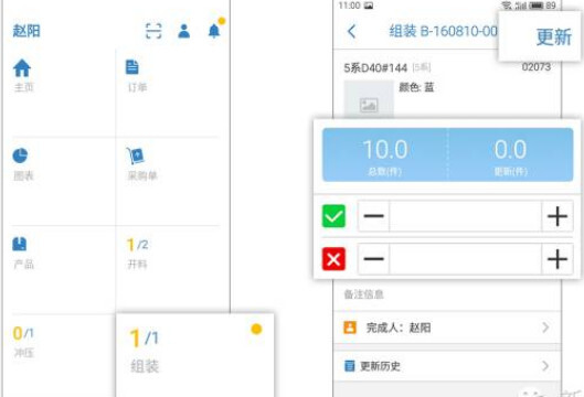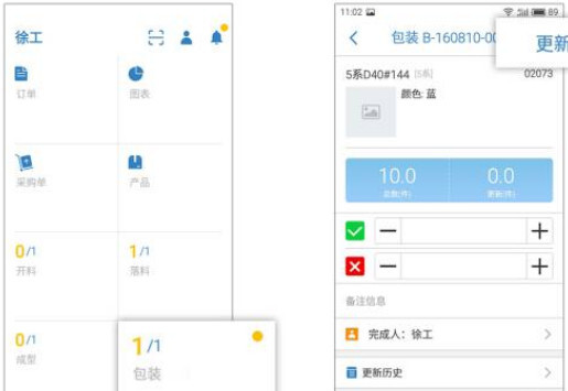生产单被派发后,工人会在手机App中得到工作提醒。点击任务后进入操作页面,通过长按蓝色区域【一键更新】或录入数据后点击【更新】的方式更新最新的生产数据。