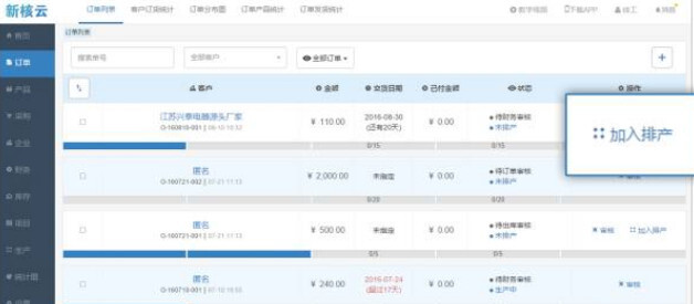 审核完成的订单,需添加至待排产列表,等待进行排产操作。在Web端的“订单 - 订单列表”里,审核通过的订单在最右侧均会显示“加入排产”按钮,点击此按钮,即可将对应的订单添加到待排产列表当中。