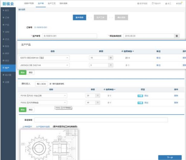 在生产 - 待排产列表里,点击列表最右侧的【生产】,即可进入生产单基本信息页面。生产负责人需按照要求,选择待生产产品、数量等基本信息,手动添加对应的生产工艺,挑选派发负责人以及每道工序的生产人员。在选择最后一道工序后,勾选【需要入库】并选定【成品库】。待所有信息确认无误后,点击【提交】,操作便完成了。