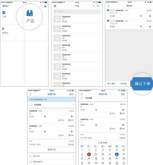 第一步:客户下单。具体操作如下:点击【产品】,进入产品列表,挑选相应产品加入购物车,输入产品数量后,点击【确认下单】,进入新增订单页面。仔细核对交货日期等全部信息无误后,点击页面右上角的【提交】,即可完成下单操作。