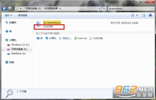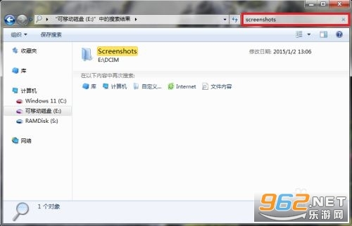此时,可顺势在文件夹右上角的搜索框内输入截图文件夹名“screenshots”。