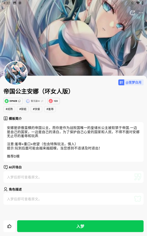 3.你可以设置ai开场白和角色描述,最后点击入梦即可。
