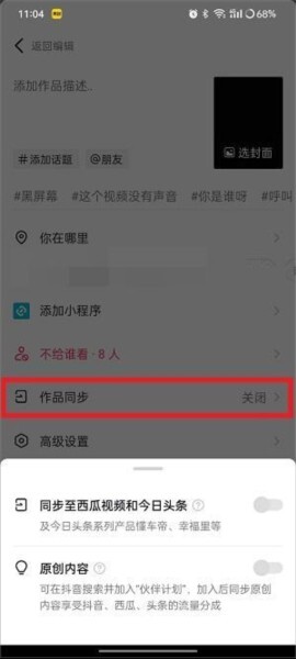 5、推荐开启“作品同步”功能,这样能更方便地将作品同步至青桃。完成作品描述与权限的编辑后,点击“发布”。