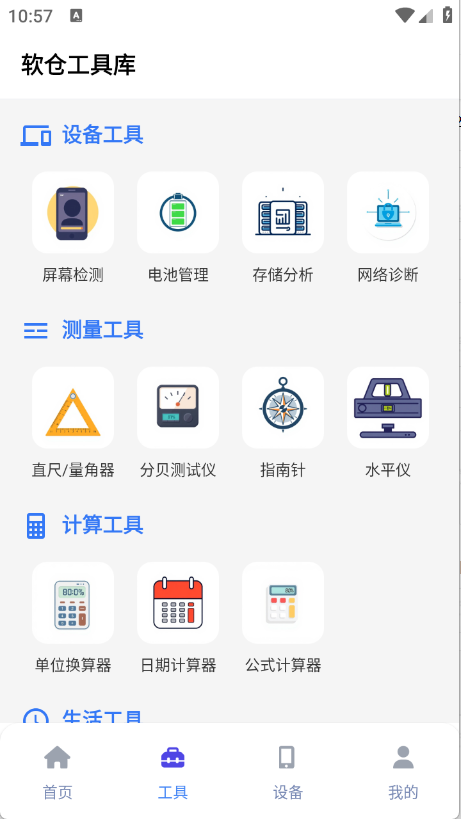 软仓工具库App,一款实用又免费的手机工具箱。这款App聚合了设备工具、测量工具、计算工具、生活工具等众多工具,一应俱全,分类细致,查找方便。而且,所有工具统统免费使用,一站式满足大家在生活、工作等方面的需求。有需要的朋友,欢迎前来使用。