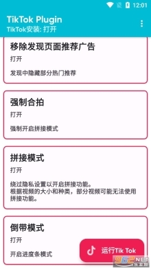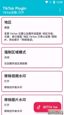 TikTok Plugin插件(换区插件)需搭配TikTok Mod国际版本使用,能实现诸多功能,其中最主要的是换区功能,此外还包括移除广告、合拍、拼接、去除水印等。通过该插件,还能在软件内一键打开TikTok,十分便捷。对于喜爱观看抖音国际版的朋友而言,这款插件绝对值得安装。