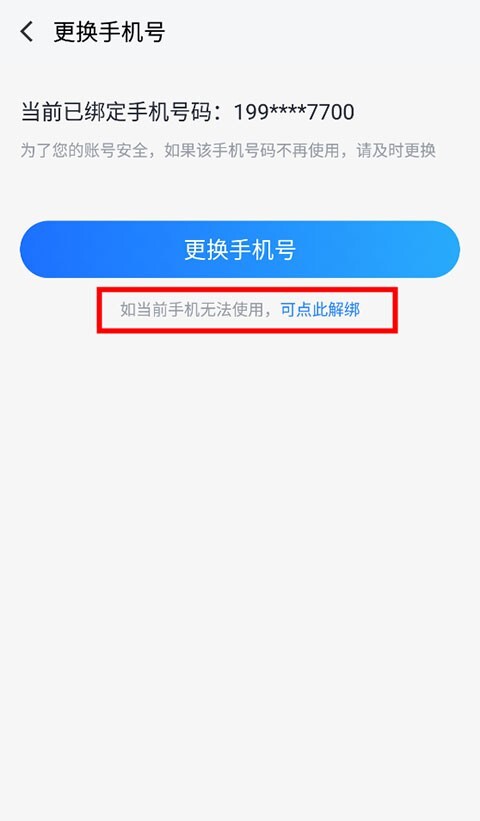 3、然后在更换手机号下方,点击“若当前手机无法使用,可点此解绑”。