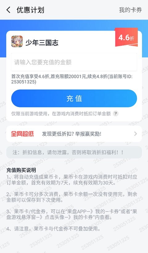 1、充值金额兑换为同等金额果币卡,果币卡用于抵扣游戏内充值订单。