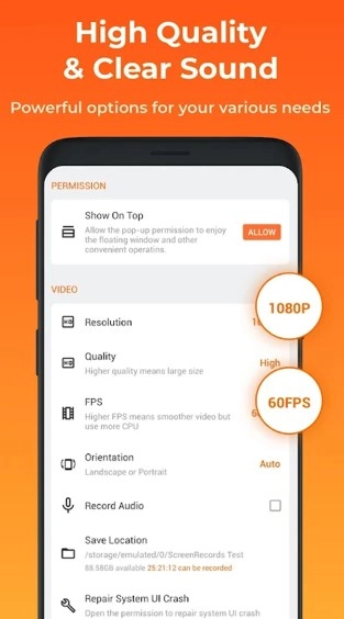 设置:在视频设置方面,录制音频的选择放置、分辨率的大小,画质的清晰度、保持路径等等;在自定义的设置中,录制模式、倒计时以及关于录屏操作的其他功能选择;工具则由截屏、拍照、画笔和显示点击操作,另外关于其他设置的选择方面,有常见问题、反馈、创建快捷方式和分享等辅助功能。