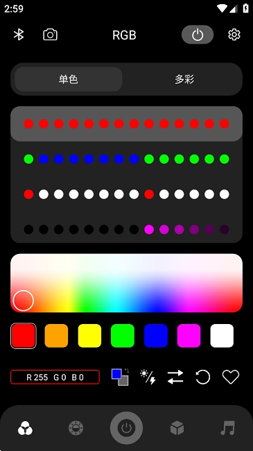 提供了摄像头取色功能、音乐律动效果,以及手机或硬件麦克风的律动效果。