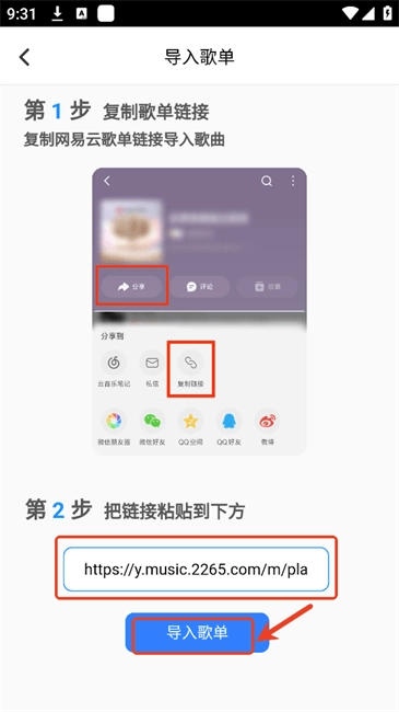 2. 分享第三方音乐平台的歌单并复制链接,把歌单链接粘贴在此处,随后点击“导入歌单”。