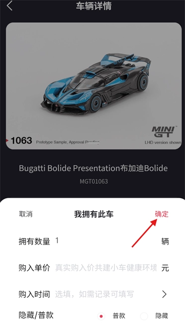 4、在弹出的信息填写框内,完善购车时间、价格、款式等细节,确认无误后点击确定完成添加。