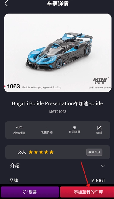 3、进入车辆详情界面后,找到“添加至我的车库”按钮,点击该选项触发收藏功能。