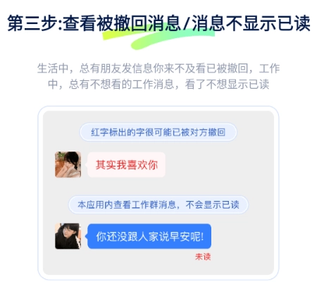第三步:查看被撤回消息/消息不显示已读。生活中,总有朋友发信息你来不及看已被撤回,工作,总有不想看的工作消息,看了不想显示已读