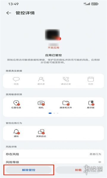 2、如被管控,点击被管控的应用,选择“解除管控”。