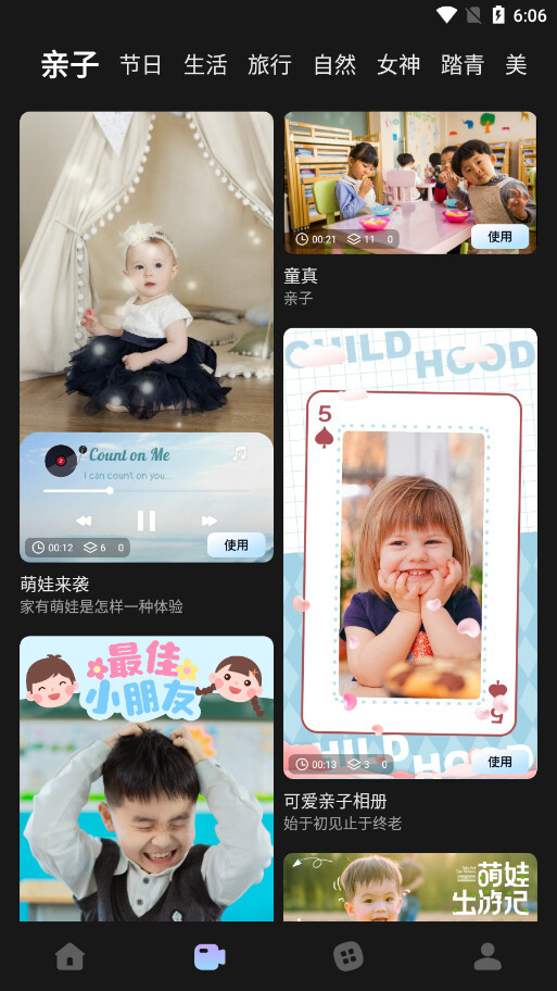 海量视频模板,操作简单,分类完备,涵盖亲子、节日、生活、旅游、自然等诸多类型,一键套用,轻松摆脱各类编辑修剪的烦恼!