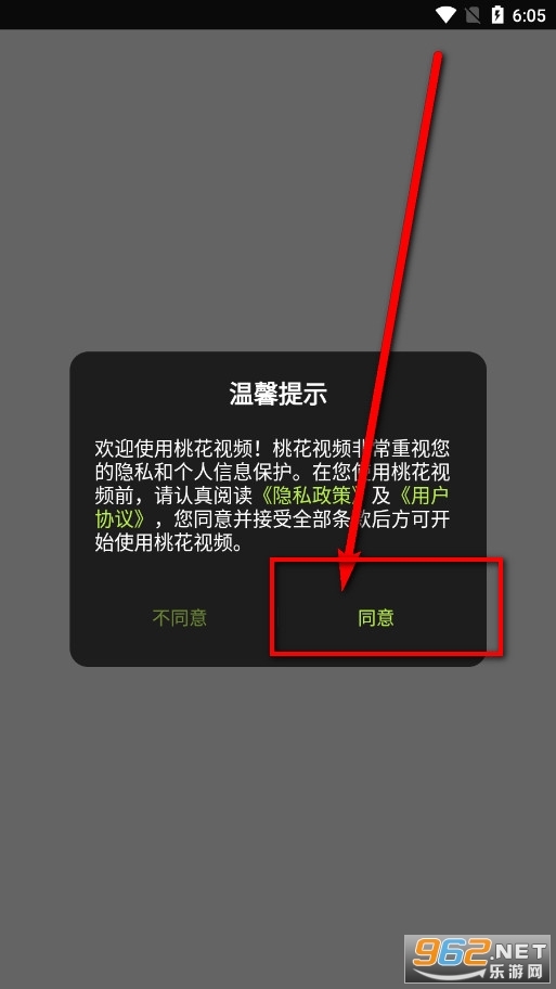 1. 前往962乐游网安装桃花视频,安装过程中需认真阅读软件的隐私政策及用户协议,阅读完毕后点选【同意】方可进入。